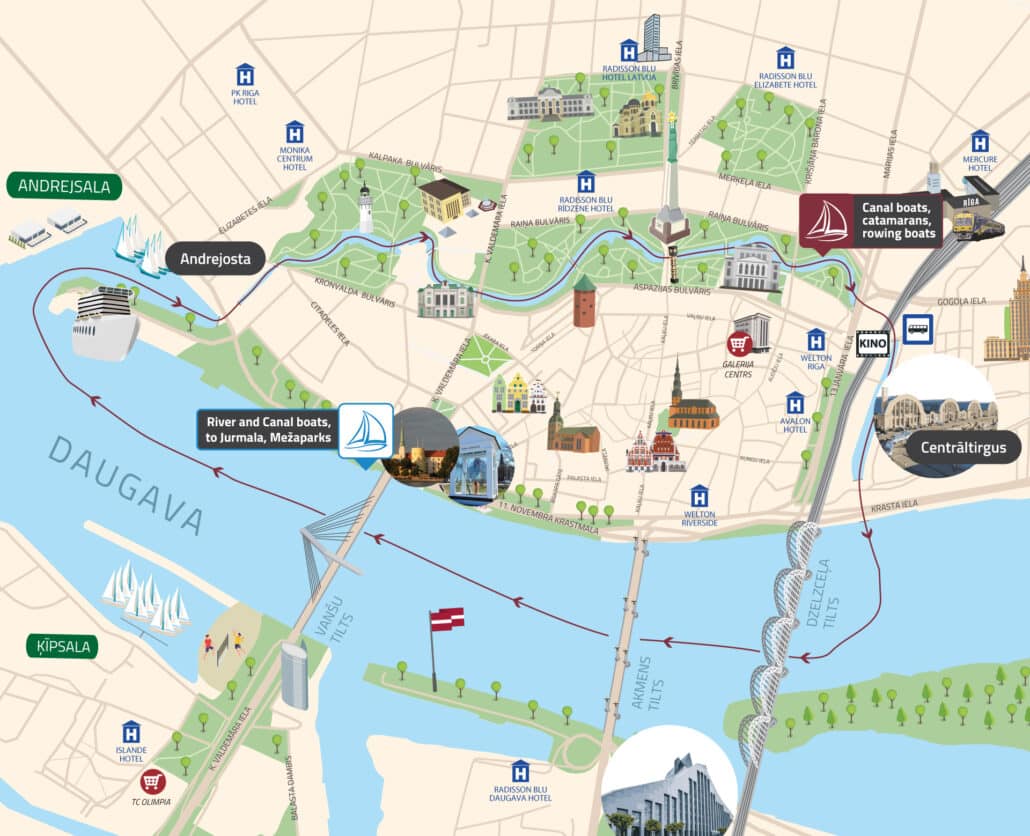We can offer you a “Riga scenery voyage” with our historical canal boat “ANNABELLA”. “ANNABELLA” is able to welcome up to 28 passengers and it’s Equipped with environmentally friendly engines! During about 50 min long “Riga scenery voyage” we can inspect the popular tourism objects from a different angle. The route while traveling along the canal meats Kronvalds Park, Bastejkalns, Latvian National Opera, Shopping centre Stockmann Riga International Coach Terminal and Riga Central Market. When entering the river Daugava you will be able to enjoy beautiful scenery of TV Tower in Zaķusala, Riga castle, Riga Cathedral and other towers of the Old city. During the voyage you will also see Andrejosta and, Riga passenger terminal.